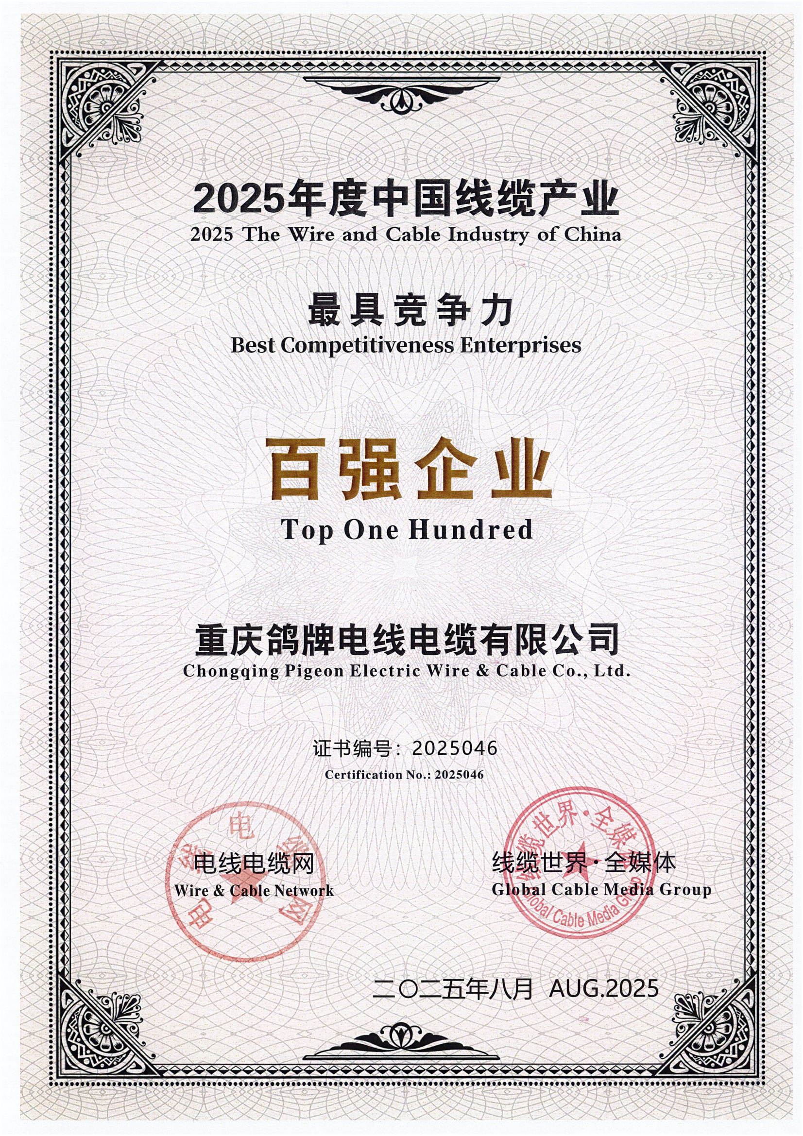 2023年中国线缆行业最具竞争力企业百强证书