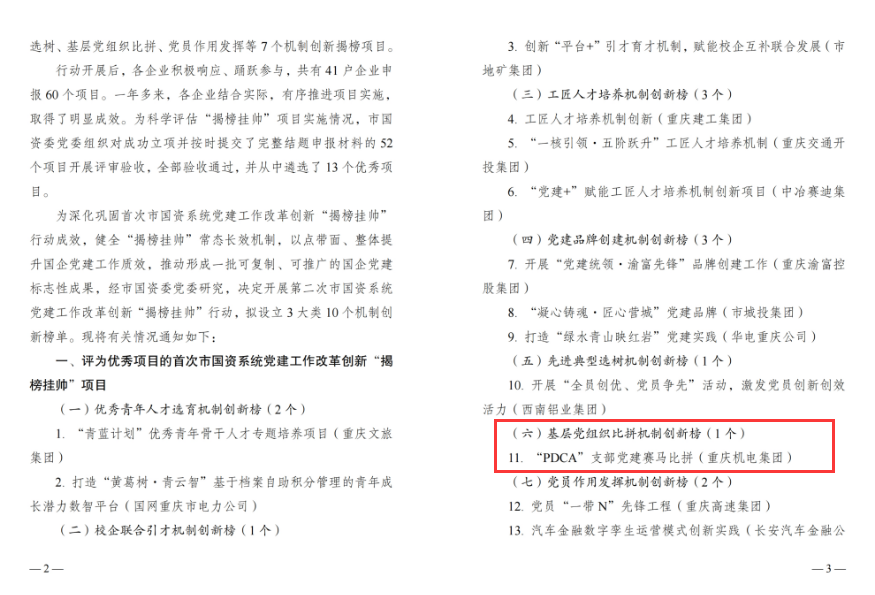 鸽牌公司党委积极参与首次重庆市国系统党建工作改革创新“揭榜挂帅”行动,通过实施为期近一年的“PDCA”支部党建赛马比拼,从市国资系统各级党组织申报的60个项目中脱颖而出,获评13个“基层党组织比拼机制创新榜”优秀项目之一,成功打造“基层党组织比拼机制创新榜”创新标杆案例。